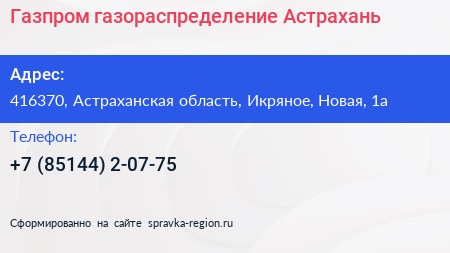 Газпром газораспределение Астрахань по адресу 416370, Астраханская область, Икряное, Новая, 1а в дальнейшем Организация, размещена в следующих категориях: