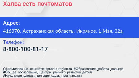 Халва, сеть почтоматов по адресу 416370, Астраханская область, Икряное, 1 Мая, 32а в дальнейшем Организация, размещена в следующих категориях: