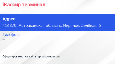 iКассир, терминал по адресу 416370, Астраханская область, Икряное, Зелёная, 5 в дальнейшем Организация, размещена в следующих категориях: