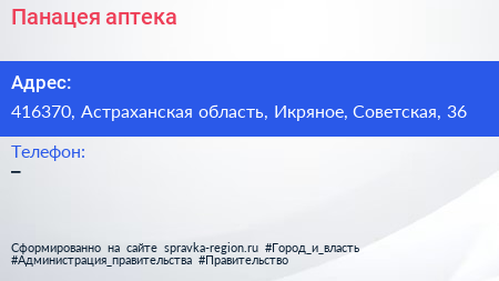 Панацея, аптека по адресу 416370, Астраханская область, Икряное, Советская, 36 в дальнейшем Организация, размещена в следующих категориях: