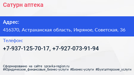 Сатурн, аптека по адресу 416370, Астраханская область, Икряное, Советская, 36 в дальнейшем Организация, размещена в следующих категориях: