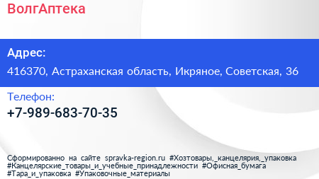 ВолгАптека по адресу 416370, Астраханская область, Икряное, Советская, 36 в дальнейшем Организация, размещена в следующих категориях: