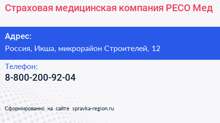 Страховая медицинская компания РЕСО-Мед по адресу ДК "Строитель", 46Н-05800, микрорайон Строителей, Некрасовский, Дмитровский городской округ, Московская область, Центральный федеральный округ, 141865, Россия в дальнейшем Организация, размещена в следующих категориях:
