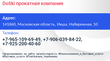 DoSki, прокатная компания по адресу 141860, Московская область, Икша, Набережная, 10 в дальнейшем Организация, размещена в следующих категориях:
