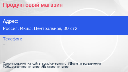 Продуктовый магазин по адресу 31, Центральная улица, посёлок опытного хозяйства «Ермолино», Дмитровский городской округ, Московская область, Центральный федеральный округ, 141863, Россия в дальнейшем Организация, размещена в следующих категориях: