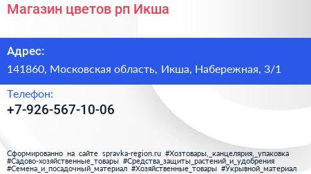 Магазин цветов, рп. Икша по адресу 141860, Московская область, Икша, Набережная, 3/1 в дальнейшем Организация, размещена в следующих категориях:
