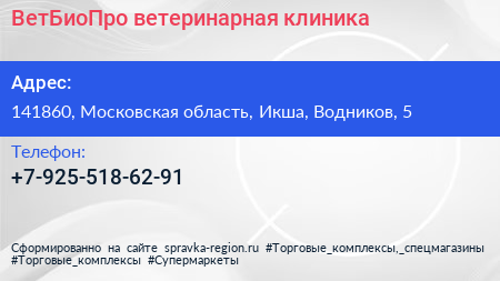 ВетБиоПро, ветеринарная клиника по адресу 141860, Московская область, Икша, Водников, 5 в дальнейшем Организация, размещена в следующих категориях: