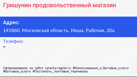 Гришунин, продовольственный магазин по адресу 141860, Московская область, Икша, Рабочая, 20а в дальнейшем Организация, размещена в следующих категориях: