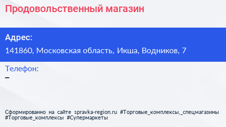 Продовольственный магазин по адресу 141860, Московская область, Икша, Водников, 7 в дальнейшем Организация, размещена в следующих категориях: