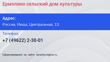 Ермолино, сельский дом культуры по адресу ДК "Ермолино", 13, Центральная улица, посёлок опытного хозяйства «Ермолино», Дмитровский городской округ, Московская область, Центральный федеральный округ, 141863, Россия в дальнейшем Организация, размещена в следующих категориях: