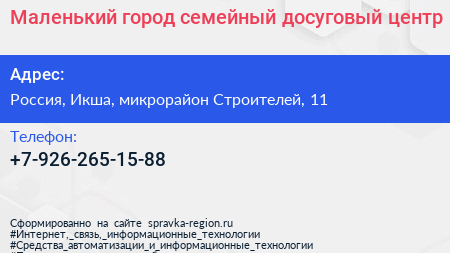 Маленький город, семейный досуговый центр по адресу Почтовое отделение 141875, 11, микрорайон Строителей, Некрасовский, Дмитровский городской округ, Московская область, Центральный федеральный округ, 141875, Россия в дальнейшем Организация, размещена в следующих категориях: