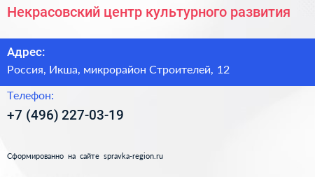 Некрасовский, центр культурного развития по адресу ДК "Строитель", 46Н-05800, микрорайон Строителей, Некрасовский, Дмитровский городской округ, Московская область, Центральный федеральный округ, 141865, Россия в дальнейшем Организация, размещена в следующих категориях: