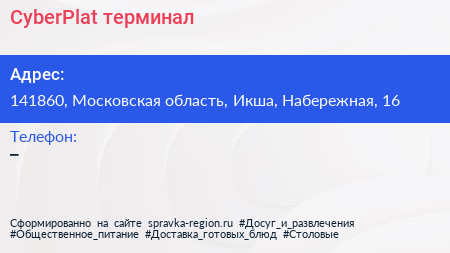 CyberPlat, терминал по адресу 141860, Московская область, Икша, Набережная, 16 в дальнейшем Организация, размещена в следующих категориях: