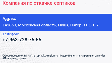 Компания по откачке септиков по адресу 141860, Московская область, Икша, Нагорная 1-я, 7 в дальнейшем Организация, размещена в следующих категориях: