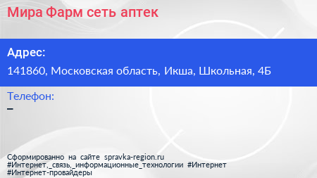 Мира-Фарм, сеть аптек по адресу 141860, Московская область, Икша, Школьная, 4Б в дальнейшем Организация, размещена в следующих категориях:
