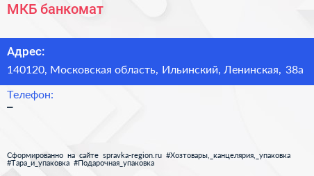 МКБ, банкомат по адресу 140120, Московская область, Ильинский, Ленинская, 38а в дальнейшем Организация, размещена в следующих категориях: