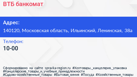 ВТБ, банкомат по адресу 140120, Московская область, Ильинский, Ленинская, 38а в дальнейшем Организация, размещена в следующих категориях:
