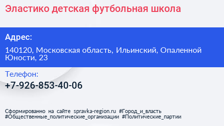 Эластико, детская футбольная школа по адресу 140120, Московская область, Ильинский, Опаленной Юности, 23 в дальнейшем Организация, размещена в следующих категориях: