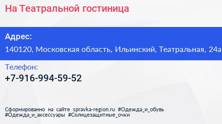 На Театральной, гостиница по адресу 140120, Московская область, Ильинский, Театральная, 24а в дальнейшем Организация, размещена в следующих категориях: