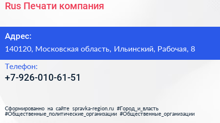 Rus Печати, компания по адресу 140120, Московская область, Ильинский, Рабочая, 8 в дальнейшем Организация, размещена в следующих категориях: