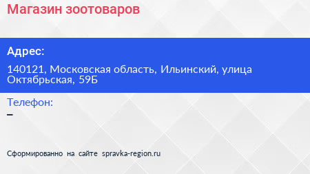 Магазин зоотоваров по адресу 140121, Московская область, Ильинский, улица Октябрьская, 59Б в дальнейшем Организация, размещена в следующих категориях:
