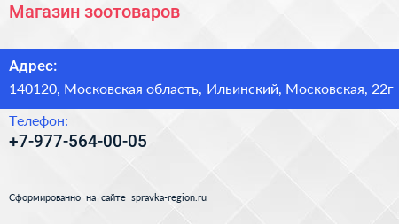 Магазин зоотоваров по адресу 140120, Московская область, Ильинский, Московская, 22г в дальнейшем Организация, размещена в следующих категориях: