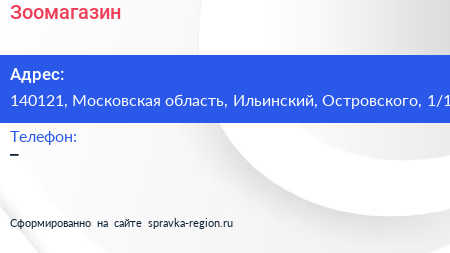 Зоомагазин по адресу 140121, Московская область, Ильинский, Островского, 1/1 в дальнейшем Организация, размещена в следующих категориях: