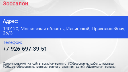 Зоосалон по адресу 140120, Московская область, Ильинский, Праволинейная, 26/3 в дальнейшем Организация, размещена в следующих категориях: