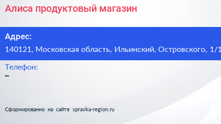 Алиса, продуктовый магазин по адресу 140121, Московская область, Ильинский, Островского, 1/1 в дальнейшем Организация, размещена в следующих категориях: