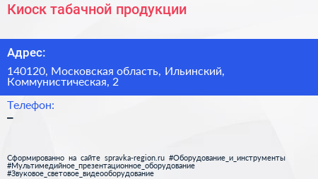 Киоск табачной продукции по адресу 140120, Московская область, Ильинский, Коммунистическая, 2 в дальнейшем Организация, размещена в следующих категориях: