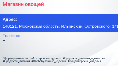 Магазин овощей по адресу 140121, Московская область, Ильинский, Островского, 1/1 в дальнейшем Организация, размещена в следующих категориях: