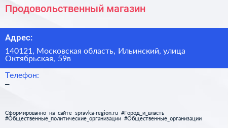 Продовольственный магазин по адресу 140121, Московская область, Ильинский, улица Октябрьская, 59в в дальнейшем Организация, размещена в следующих категориях: