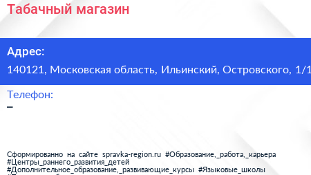 Табачный магазин по адресу 140121, Московская область, Ильинский, Островского, 1/1 в дальнейшем Организация, размещена в следующих категориях: