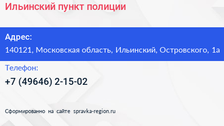Ильинский пункт полиции по адресу 140121, Московская область, Ильинский, Островского, 1а в дальнейшем Организация, размещена в следующих категориях: