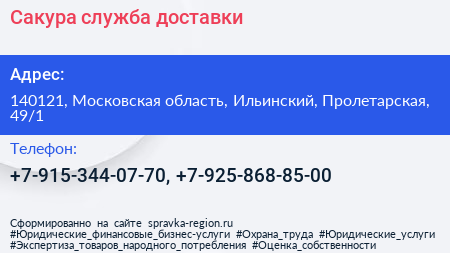Сакура, служба доставки по адресу 140121, Московская область, Ильинский, Пролетарская, 49/1 в дальнейшем Организация, размещена в следующих категориях: