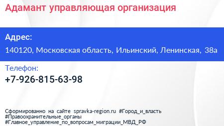 Адамант, управляющая организация по адресу 140120, Московская область, Ильинский, Ленинская, 38а в дальнейшем Организация, размещена в следующих категориях: