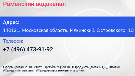 Раменский водоканал по адресу 140121, Московская область, Ильинский, Островского, 10 в дальнейшем Организация, размещена в следующих категориях:
