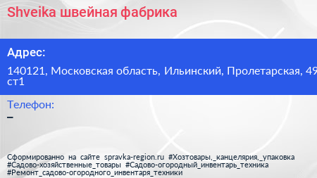 Shveika, швейная фабрика по адресу 140121, Московская область, Ильинский, Пролетарская, 49 ст1 в дальнейшем Организация, размещена в следующих категориях: