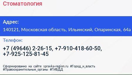 Стоматология по адресу 140121, Московская область, Ильинский, Опаринская, 64а в дальнейшем Организация, размещена в следующих категориях:
