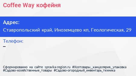 Coffee Way, кофейня по адресу Ставропольский край, Иноземцево кп, Геологическая, 29 в дальнейшем Организация, размещена в следующих категориях: