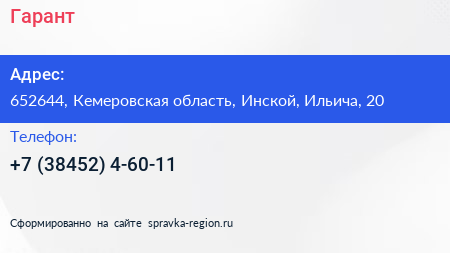 Гарант по адресу 652644, Кемеровская область, Инской, Ильича, 20 в дальнейшем Организация, размещена в следующих категориях: