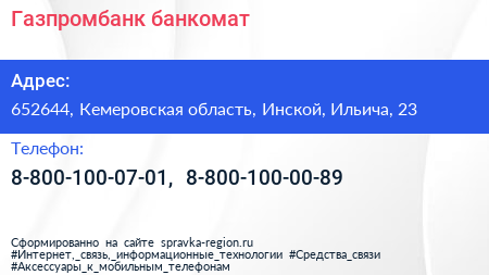 Газпромбанк, банкомат по адресу 652644, Кемеровская область, Инской, Ильича, 23 в дальнейшем Организация, размещена в следующих категориях: