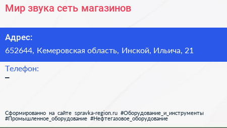 Мир звука, сеть магазинов по адресу 652644, Кемеровская область, Инской, Ильича, 21 в дальнейшем Организация, размещена в следующих категориях: