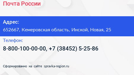 Почта России по адресу 652667, Кемеровская область, Инской, Новая, 25 в дальнейшем Организация, размещена в следующих категориях: