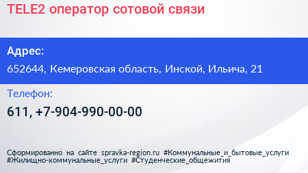 TELE2, оператор сотовой связи по адресу 652644, Кемеровская область, Инской, Ильича, 21 в дальнейшем Организация, размещена в следующих категориях: