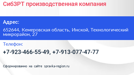 СибЗРТ, производственная компания по адресу 652644, Кемеровская область, Инской, Технологический микрорайон, 27 в дальнейшем Организация, размещена в следующих категориях: