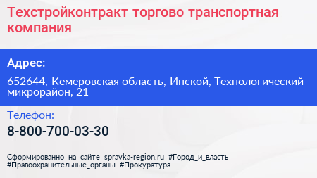 Техстройконтракт, торгово-транспортная компания по адресу 652644, Кемеровская область, Инской, Технологический микрорайон, 21 в дальнейшем Организация, размещена в следующих категориях: