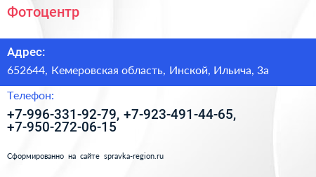 Фотоцентр по адресу 652644, Кемеровская область, Инской, Ильича, 3а в дальнейшем Организация, размещена в следующих категориях: