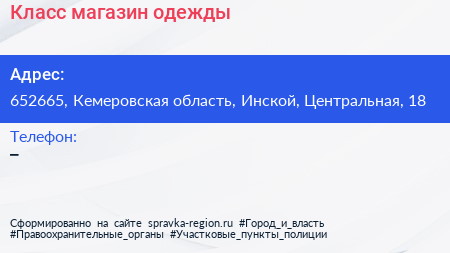 Класс, магазин одежды по адресу 652665, Кемеровская область, Инской, Центральная, 18 в дальнейшем Организация, размещена в следующих категориях: