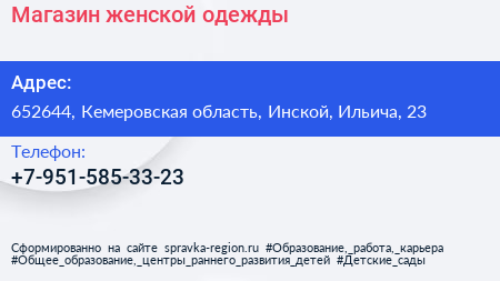 Магазин женской одежды по адресу 652644, Кемеровская область, Инской, Ильича, 23 в дальнейшем Организация, размещена в следующих категориях: